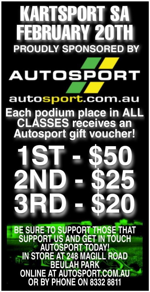 Keaton Bowler of Autosport has been kind enough to jump on board for our February 20th race meeting and is putting up vouchers for ALL podium places in ALL classes! Yeah, you read that right, ALL classes! Autosport has been supplying racers for over 35 years and you don’t do that unless you’re doing something right, like sponsoring Kartsport SA for example